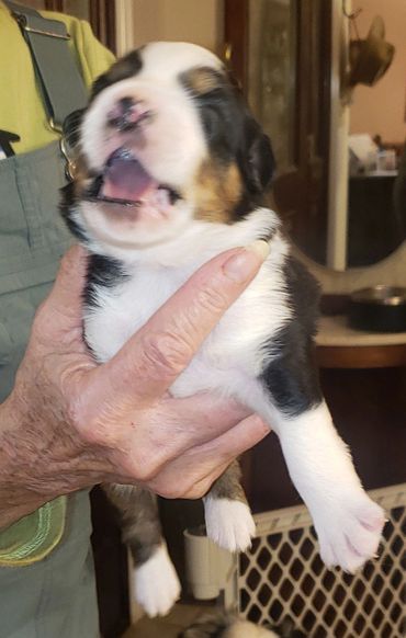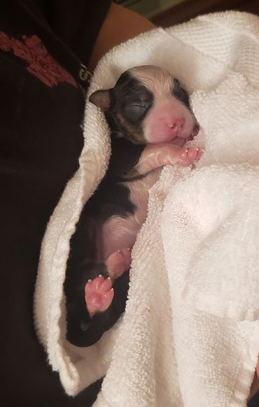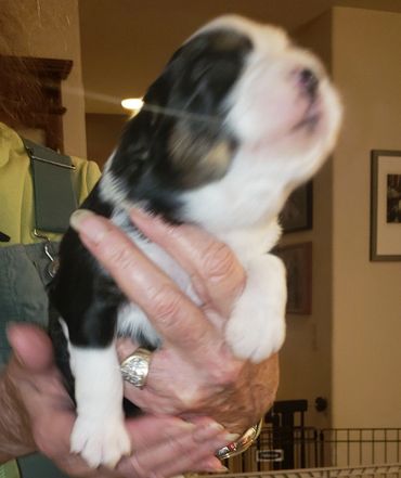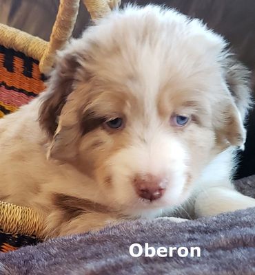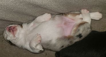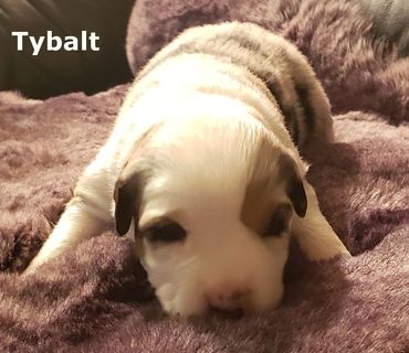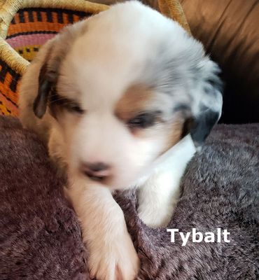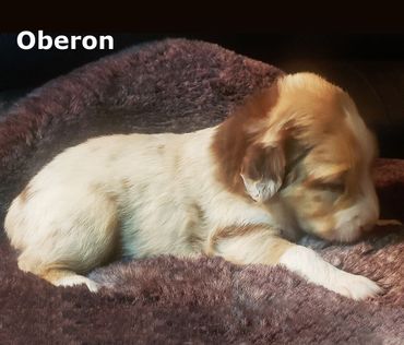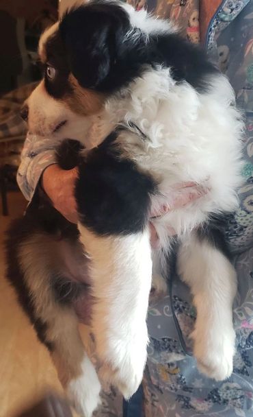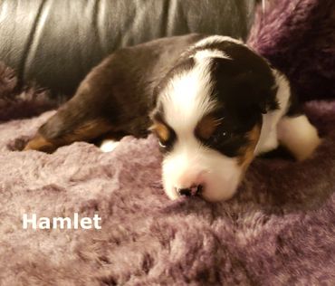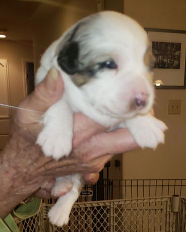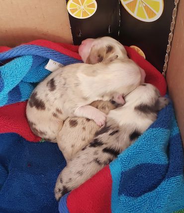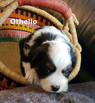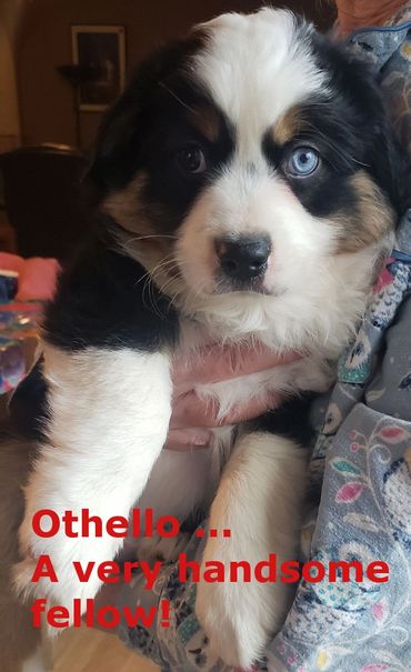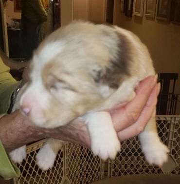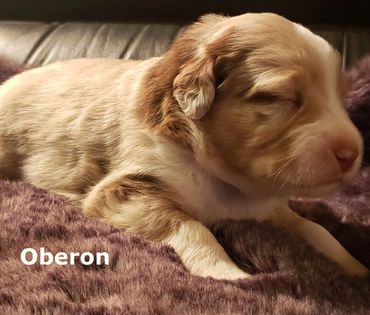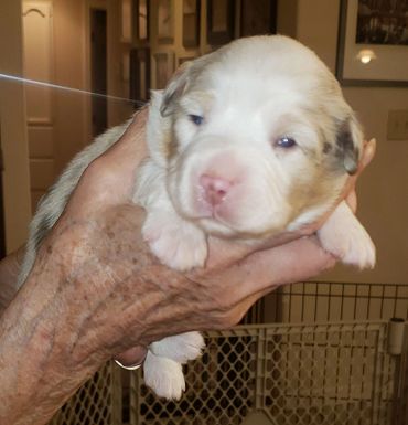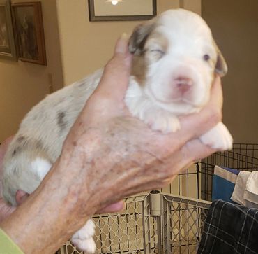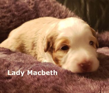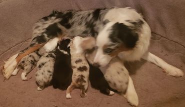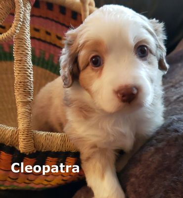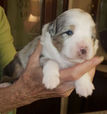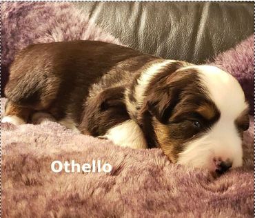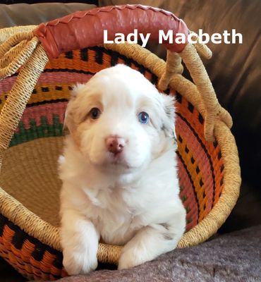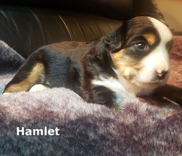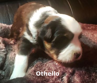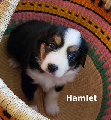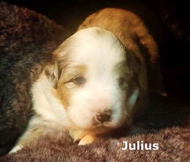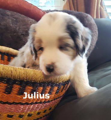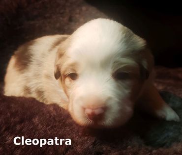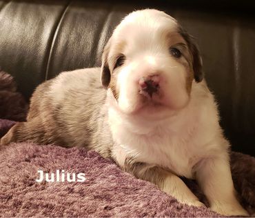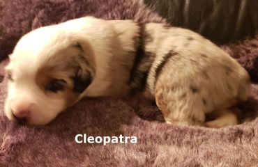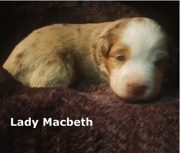 Juliette had a litter of seven puppies. There are two blue merles (both male - Julius and Tybalt), three red merles (one male -Oberon, and two females - Lady Macbeth and Cleopatra) and two tris (both male - Othello and Hamlet.) They are all healthy, thriving, growing fast and longing to go to their furever homes.